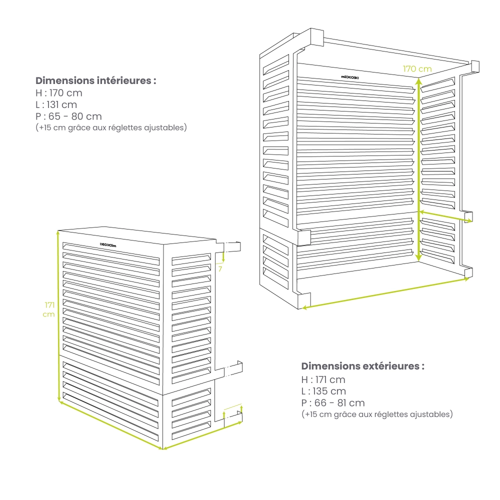 Grande hauteur, extralarge et très profond, les dimensions XL+ de ce coffrage pour PAC vous permettent d’y cacher les plus grandes pompes à chaleur. Nos coffres sont même associables et juxtaposables entre eux pour obtenir le super coffrage aux dimensions sur mesure qu’il vous faut. Ici, ont été associés par exemple un coffre XL et un accessoire XL pour obtenir ce très grand format.