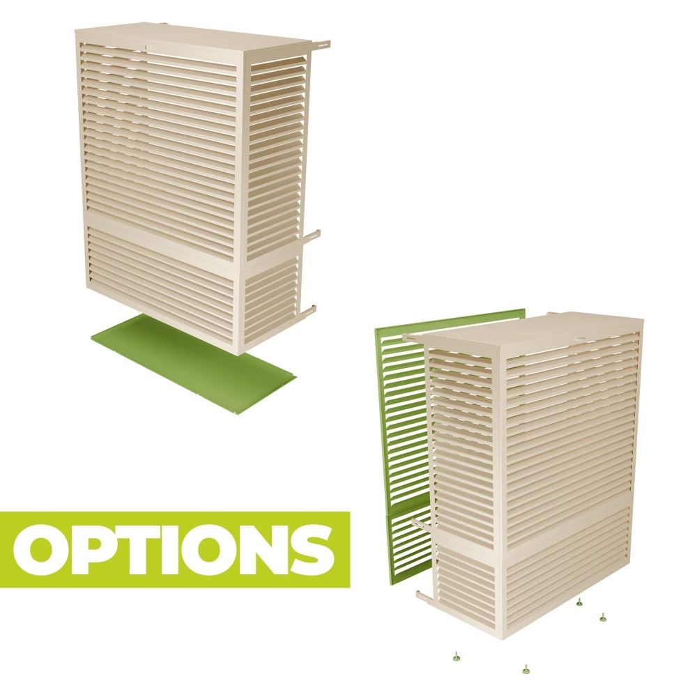The Decoclim trunk acts as an insulating box that reduces noise pollution from 10 to 30% while allowing air to always circulate around the CAP thanks to the ultra -efficient design of its shutters. A large formwork to be installed or hanging, designed for easy maintenance The Decoclim heat pump cover is planned to adapt to all configurations and constraints thanks to its many accessories. It can be placed on the ground or suspended in height, on the facade of the house or the building, thanks to its hook system which allows it to be dropped simply to carry out the maintenance and the annual maintenance of the heat pump.