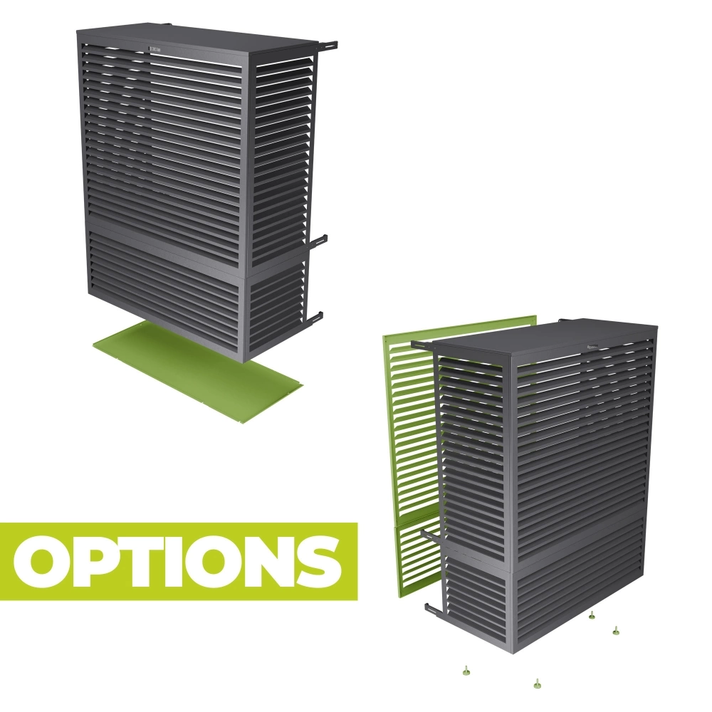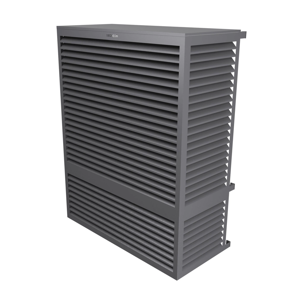 The Decoclim heat pump cover is planned to adapt to all configurations and constraints thanks to its many accessories. It can be placed on the ground or suspended in height, on the facade of the house or the building, thanks to its hook system which allows it to be dropped simply to carry out the maintenance and the annual maintenance of the heat pump.