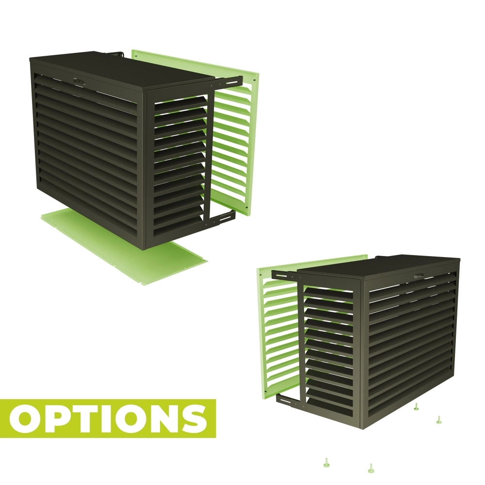 Esta caja calada está disponible en 3 colores a elegir para vestir discretamente tu bomba de calor: gris antracita, blanco o madera exótica.