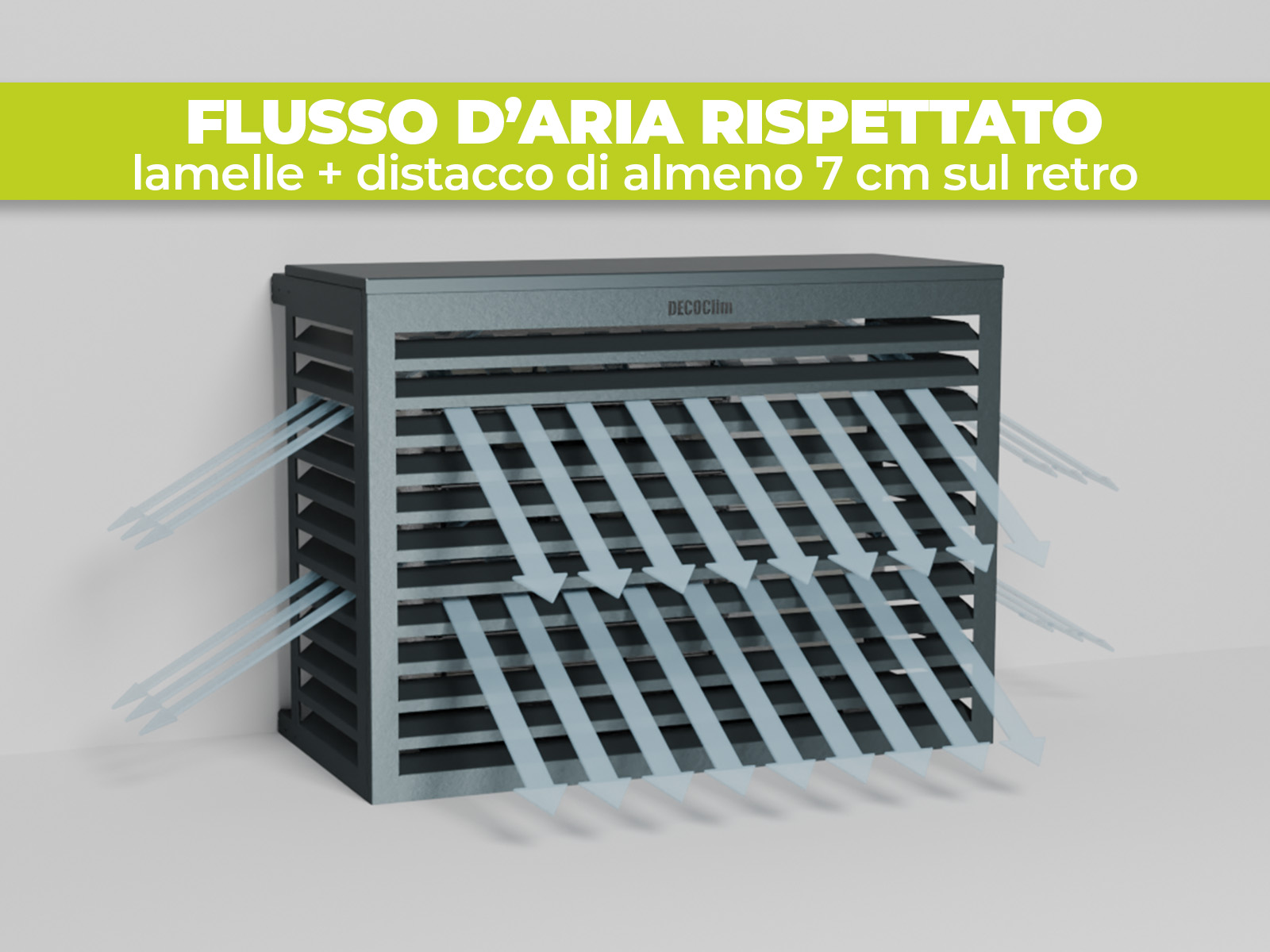 ATTENZIONE: Lo studio garantisce il rispetto del flusso d'aria con il design DECOCLIM e non con una copertura per pompa di calore o condizionatore di un'altra marca.